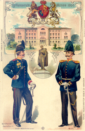 Karte der Kgl. Hannoverschen Armee von 1866. Rechts ein Militärarzt. Oben zu sehen, das Militärhospital an der Adolfstraße.