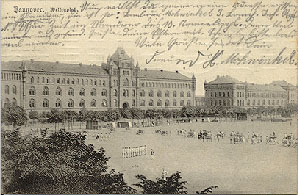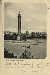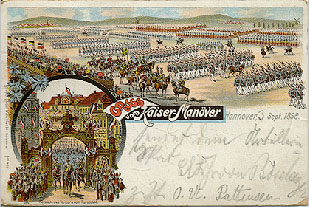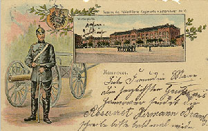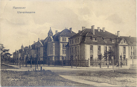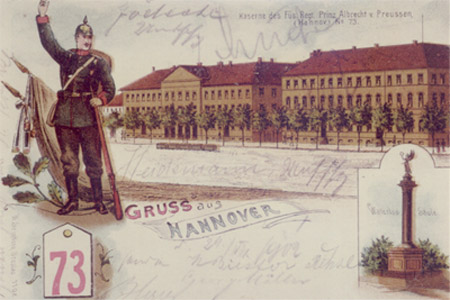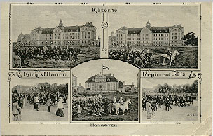 Exerzieren auf dem heute noch gleichnamigen Welfenplatz. Kasernengebäude sind größenteils erhalten und werden von der Polizei genutzt.