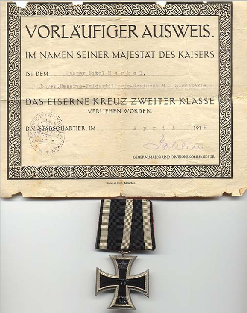 Vorläufige Verleihungsurkunde zum Eisernen Kreuz 2. Klasse vom April 1918.