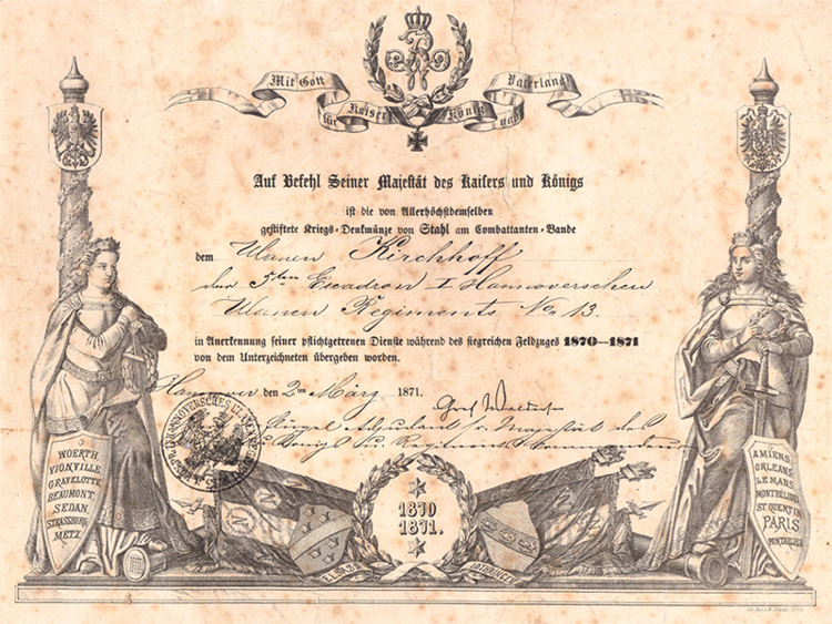 Urkunde zum Feldzug 1870/71 für den Ulanen Kirchhoff vom 02.03.1871.