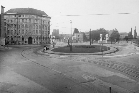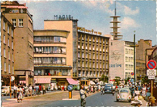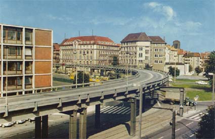 Karmaschstraße Blickrichtung auf die Bahnhofstraße 1964. Im Hintergrund befindet sich der Fernsehturm im Aufbau. Heute ist er lediglich noch Werbeträger von VW.