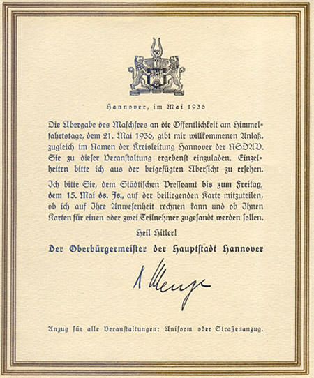 Einladungskarte zur Übergabe des Maschsees an die Öffentlichkeit am 21.05.1936.