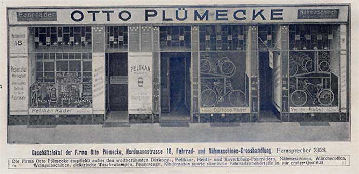 Aussenansicht der Firma Otto Plümecke Fahrrad und Nähmaschinien - Großhandlung um 1910