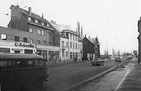 Blick in die Vahrenwalder Straße, stadteinwärts. Anfang 1970. Linker Bildrand: Gaststätte "Am Wasserturm".