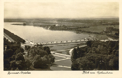 Blick vom Rathausturm auf den Maschsee um 1940. Man beachte den Hintergrund.