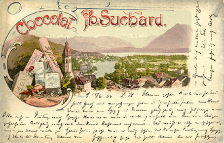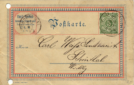 Auf dieser Karte von 1890 wirbt die Firma Emil Herbst aus Ulm für Schürzen-Flanell und Tricot-Confection in der linken oberen Ecke.