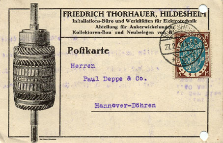 Mit dieser Karte wurde am 27.2.1920 ein Stecker, dreipolig, 60A bei der Firma Deppe in Hannover bestellt.