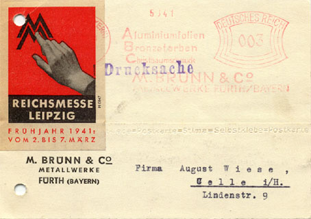 Karte mit Werbeaufkleber für die Reichsmesse 1941 in Leipzig.